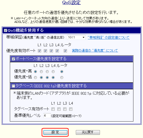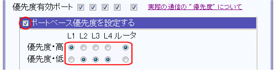 優先度有効ポート:L1〜L4、ルータ全てチェックあり