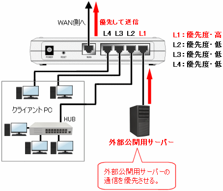 | 本設定を行うことにより、外部公開用サーバーの通信を優先させることや、特定のパソコンの通信を優先させること等が可能となります。 |