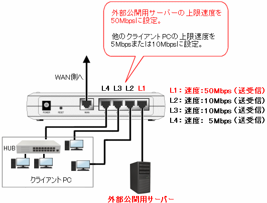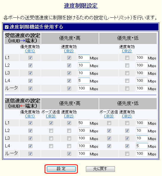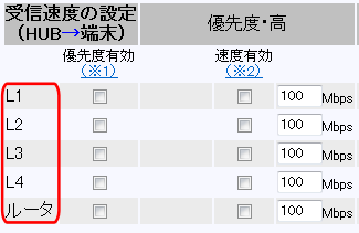 QoS設定に加え、上記のように速度制限設定を行った場合、L1の上限速度は約20Mbps、L2〜L4の上限速度は約5Mbpsとなります。 |