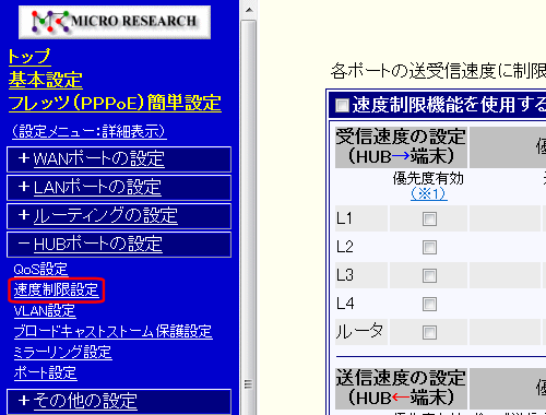 メニューの「HUBポートの設定」の中の[速度制限設定]をクリックして下さい。