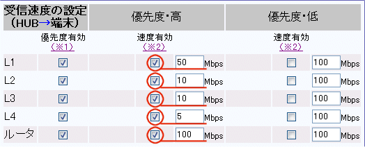 優先度有効:チェックあり 優先度・高 速度有効:チェックあり 速度:5Mbps |