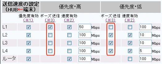 優先度有効:チェックあり 優先度・高 ポーズ送信:チェックあり 速度有効:チェックあり 速度:20Mbps |