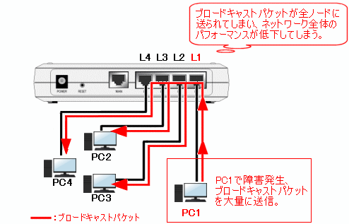 | ネットワーク内の機器の障害等によってブロードキャストパケットが大量に送信された場合(ブロードキャストストーム)、ネットワーク全体のパフォーマンスが低下したり通信エラーが発生する等、ネットワーク障害が発生します。 |