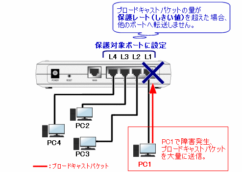 保護対象ポートが受信したパケットのうち、ブロードキャストパケットの量が保護対象レートの値を超えた場合、ブロードキャストパケットを他へ転送しません。