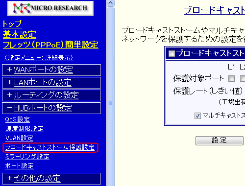 - メニューの「HUBポートの設定」の中の[ブロードキャストストーム保護設定]をクリックして下さい。