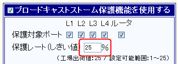 保護対象ポートから出力されるパケットのうち、ブロードキャストパケットが25%を超えた場合、ブロードキャストパケットを他のポート(保護対象ポート)へ転送しません。 |