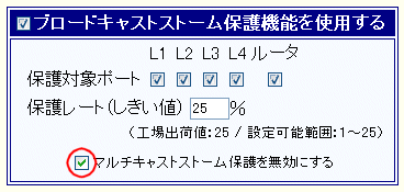 - マルチキャストストーム保護を行う場合、[マルチキャストストーム保護を無効にする]のチェックを外して下さい。