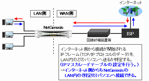 IPマスカレードテーブル設定は、インターネット側から接続が開始されるIPフレーム(プロトコル・ポート番号)を、NetGenesisがLAN内の特定のパソコン(IPアドレス)へ正しく送るように制御(ルーティング)するための設定です。