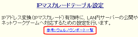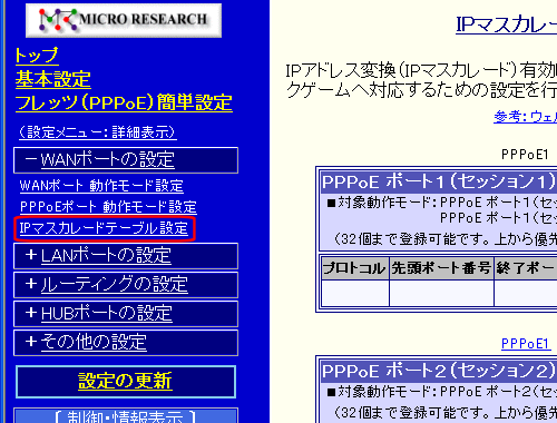 設定画面メニューの「WANポートの設定」の中の、[IPマスカレードテーブル設定]をクリックして下さい。