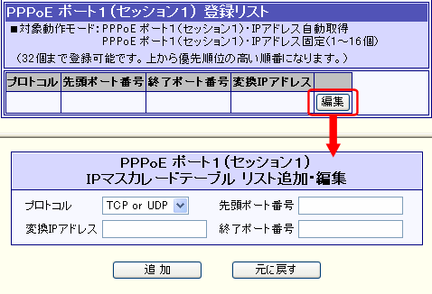「IPマスカレードテーブル リスト追加・編集」画面が表示されます。
