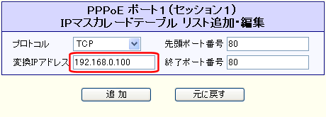 [変換IPアドレス]欄に、LAN内のルーティング先パソコンのIPアドレスを入力して下さい。