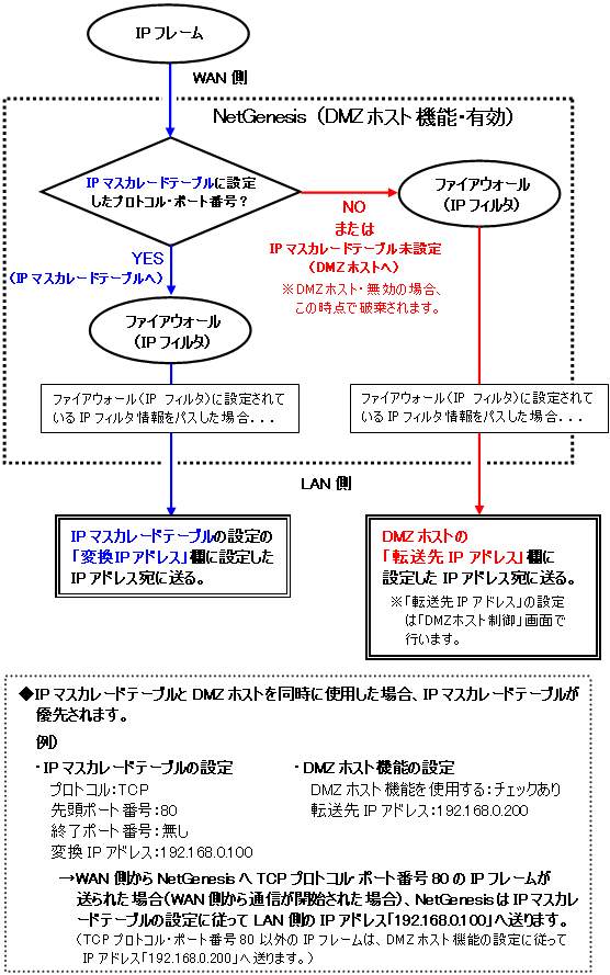 また、IPマスカレードテーブルとDMZホスト機能、ファイアウォールの関係は、以下の図のようになっています。