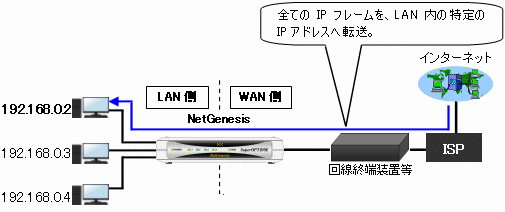 DMZホスト機能とは「インターネット側(WAN側)から発信された全てのIPフレームを、LAN内の特定のIPアドレスへ転送する機能」です。 |