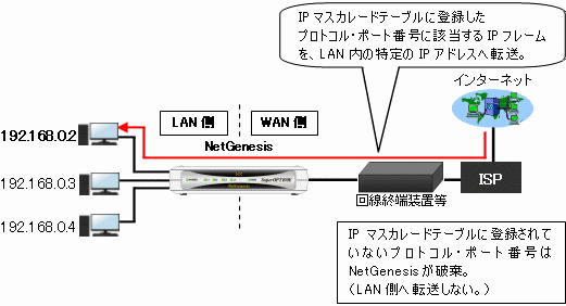 IPマスカレードテーブルとは、「インターネット側から発信されたIPフレームを、プロトコルやポート番号に応じてLAN内の特定のIPアドレスへ転送する機能」です。 |