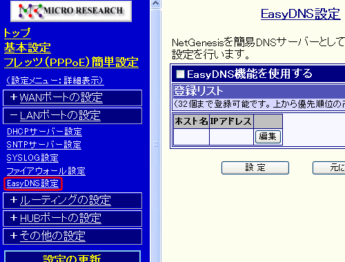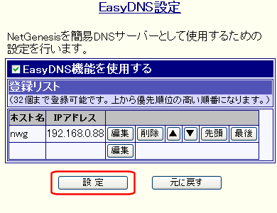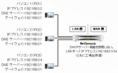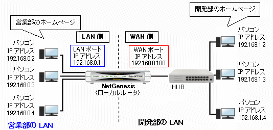 | それぞれのLAN内のホームページを登録する例 (ローカルルータとして使用する際の例) 以下の構成図・設定画面は、営業部のLAN内のホームページと開発部のLAN内のホームページをNetGenesisに登録する例です。 ![]() ※LAN側・WAN側ともに、サブネットは「/24」(255.255.255.0)です。