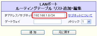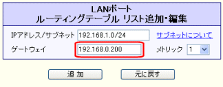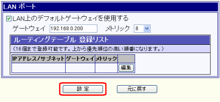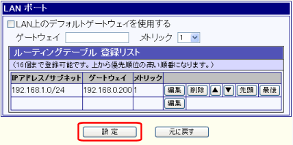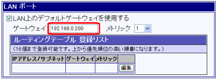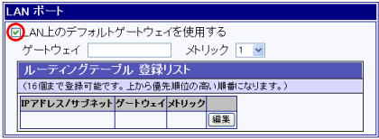 「WANポートのスタティックルーティング設定」の[WANポートをデフォルトゲートウェイに設定する]のチェックを外した状態です。 |