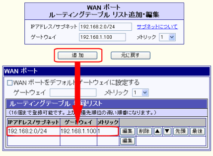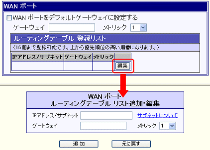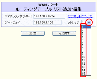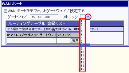 他のルータ等を優先させる場合、環境に応じてメトリック値を選択して下さい。 |
