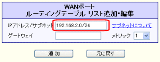 WANポートの動作モードを「IPアドレス固定(1〜16個)」または「アンナンバード(unnumbred)」に設定した場合、「WAN側 ネットワークの設定」欄の中の[デフォルトゲートウェイ]欄に入力したIPアドレスが表示されます。 |