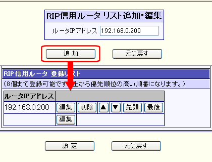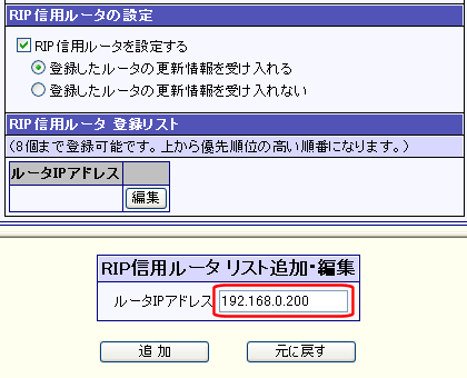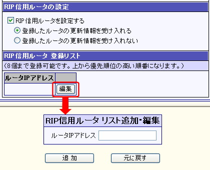 「RIP信用ルータ リスト追加・編集」画面が表示されます。