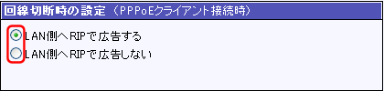 「PPPoEクライアント接続」使用時、回線切断が発生した際に、LAN側へRIPで広告するか否かを選択します。