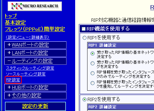 1. 設定画面のメニューの「ルーティングの設定」の中の、[RIP設定]をクリックして下さい。