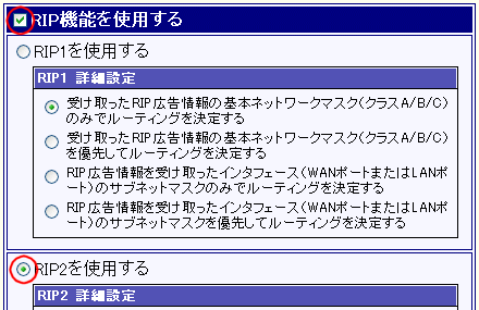 2. [RIP機能を使用する]にチェックを入れ、[RIP2を使用する]を選択して下さい。