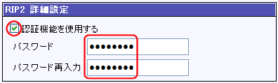 パスワードを設定する場合は、[RIP2 詳細設定]の中の[認証機能を使用する]にチェックを入れ、[パスワード]、及び[パスワード再入力]欄にパスワードを半角英数字で入力して下さい。