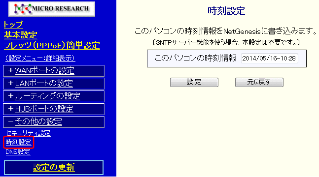 NetGenesisの設定を更新・再起動した場合、またはNetGenesisの電源をOFFにした場合、NetGenesisの時刻情報はリセットされますので、本設定を再度行って下さい。