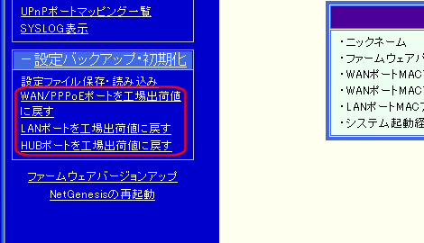 設定画面のメニューの「設定バックアップ・初期化」をクリックし、工場出荷値に戻すポート(WAN/PPPoEポート・LANポート・HUBポート)のリンクをクリックして下さい。