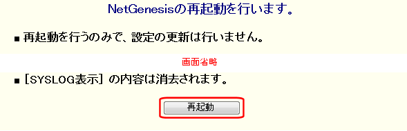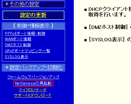→ ファームウェアのバージョンアップや(現在動作中の)設定内容の確認を行う際は、事前にNetGenesisの再起動を行い、設定の「一時保存領域」の情報を消去しておくことをお勧めします。