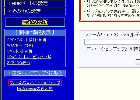 1. 設定画面のメニューの、[ファームウェアバージョンアップ]をクリックして下さい。