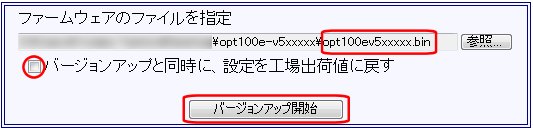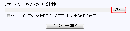 バージョンアップと同時に設定を工場出荷値に戻す場合、[バージョンアップと同時に、設定を工場出荷値に戻す]にチェックを入れて下さい。