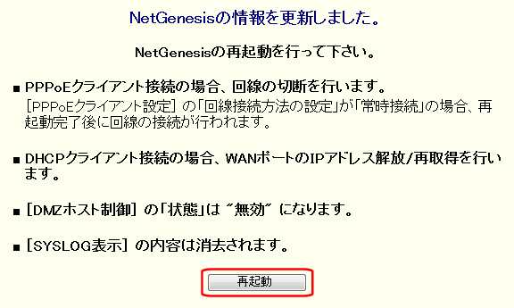 1. 設定画面のメニューの[NetGenesisの再起動]をクリックして下さい。