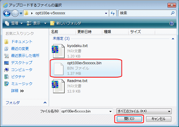 4. 「アップロードするファイルの選択」画面が表示されますので、解凍したフォルダ内のバージョンアップファイルを選択して、[開く]ボタンをクリックして下さい。