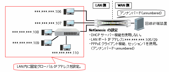 NetGenesisのWAN側をアンナンバード(unnumbered)に設定することにより、LAN内でグローバルIPアドレスを利用することが可能になります。