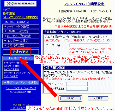 「設定の更新」を行わないと、設定内容がNetGenesisに反映されません(書き込まれません)ので注意して下さい。 |
