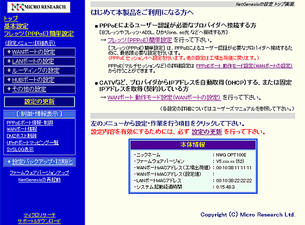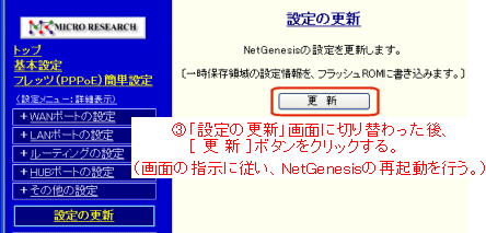 NetGenesisの設定が完了した場合、必ず「設定の更新」を行って下さい。 |