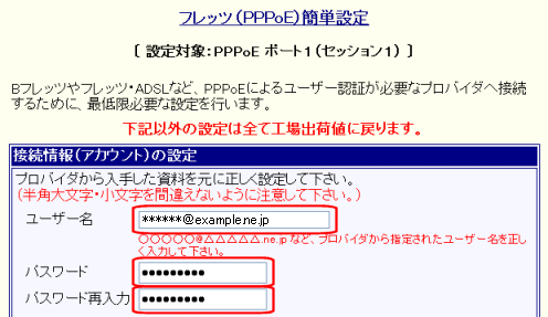 フレッツ(PPPoE)簡単設定 で設定する内容