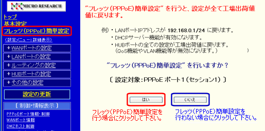 フレッツ(PPPoE)簡単設定 をクリックすると、今までの設定値が全て工場出荷値に戻りますので注意して下さい。