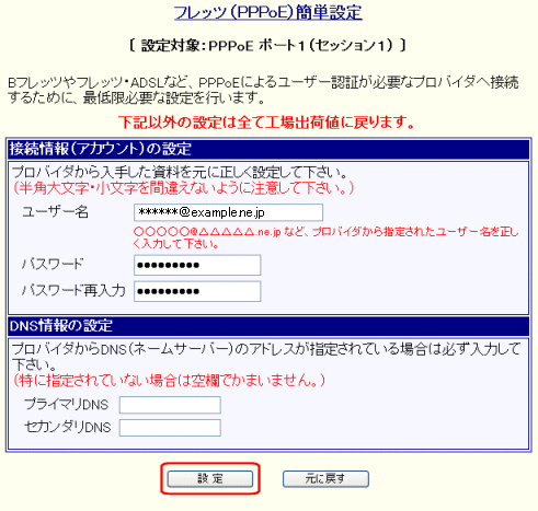 フレッツ(PPPoE)簡単設定 を行うと(設定画面のメニューの[フレッツ(PPPoE)簡単設定]をクリックすると)、「フレッツ(PPPoE)簡単設定」で設定した内容以外、全ての設定が工場出荷値に戻ります。