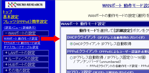 手順2) 設定画面のメニューの「WANポートの設定」の中の、[WANポート 動作モード設定]をクリックして下さい。