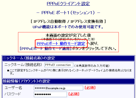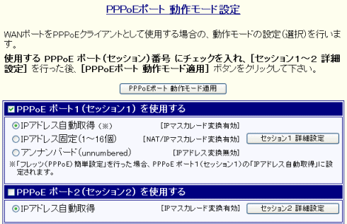 「PPPoEポート 動作モード設定」設定画面が表示されます。