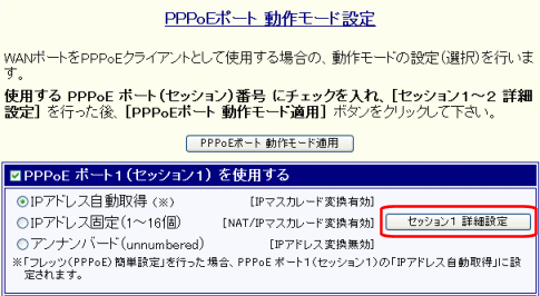 PPPoE ポート1(セッション1)の詳細設定を行う際にクリックします。