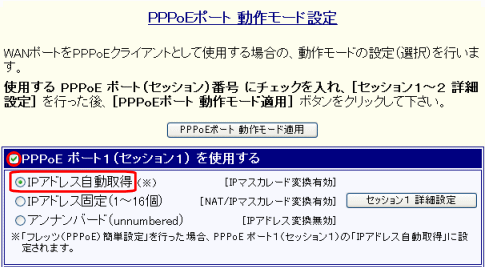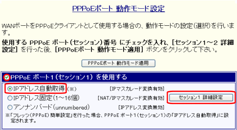 PPPoE ポート1(セッション1) を使用する :チェックあり(有効)