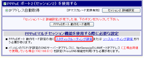 「PPPoE ポート2(セッション2) IPアドレス自動取得設定」の他に、スタティックルーティング設定が必要です。