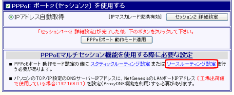 「PPPoE ポート2(セッション2) IPアドレス自動取得設定」の他に、ソースルーティング設定が必要です。