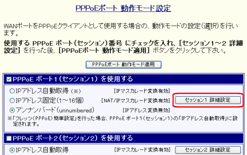 PPPoE ポート1〜2(セッション1〜2) の詳細設定を行った場合は、本ボタンを必ずクリックして下さい。 |