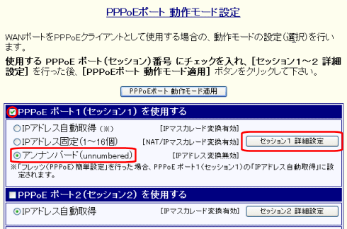 以上の操作により、PPPoE ポート1(セッション1)の詳細設定と、