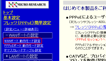 設定画面のメニューの「WANポートの設定」の中の、[WANポート 動作モード設定]をクリックして下さい。