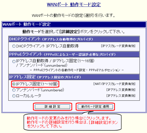WANポートの「動作モード設定」について説明します。